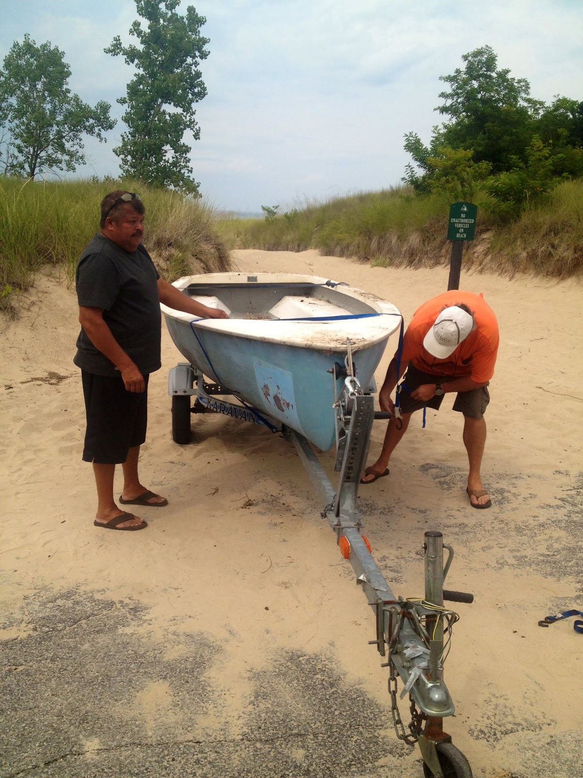 When we first brought Makeba back, we put her on display for the day at Beach Glass Cafe in Long Beach, IN. Our fantastic friends started up their own adorable coffee and ice cream shop by Stop 24 - be sure to check it out sometime! They offered to have some photos of our trip up in the shop and serve as the sending off place for Makeba's final launch. As the evening neared, we planned to set off for an evening sail, but Mary's back had other plans. We were getting ready to pull Makeba down to the water, but Mary's back just flat out said, "Nope." She has had problems with her back before (imagine that, hacking away at a tree for 4 years and then hauling said tree in and out of the water all summer), so we decided not to risk it. We would try to voyage out in a few days when she was feeling up for it!